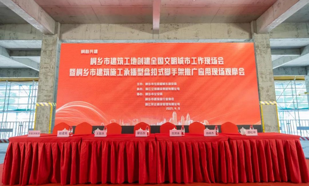 立信|桐鄉(xiāng)市建筑工地創(chuàng)建全國(guó)文明城市工作現(xiàn)場(chǎng)會(huì)暨桐鄉(xiāng)市建筑施工承插型盤(pán)扣式腳手架推廣應(yīng)用現(xiàn)場(chǎng)觀摩會(huì)在我公司指揮中心項(xiàng)目召開(kāi)