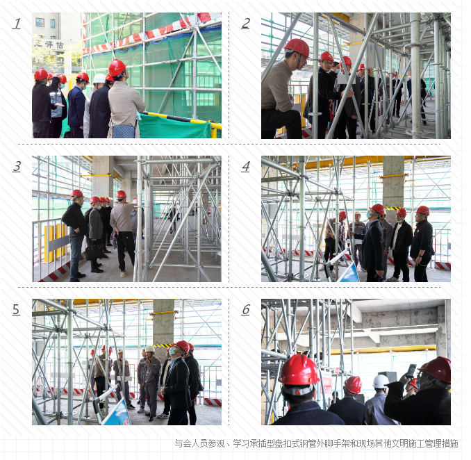 會(huì)議第一項(xiàng)議程,與會(huì)人員參觀、學(xué)習(xí)了承插型盤(pán)扣式鋼管外腳手架和現(xiàn)場(chǎng)其他文明施工的管理措施,對(duì)細(xì)節(jié)處理問(wèn)題進(jìn)行了技術(shù)交流。我集團(tuán)生產(chǎn)部科技部相關(guān)人員為與會(huì)人員作詳細(xì)講解。