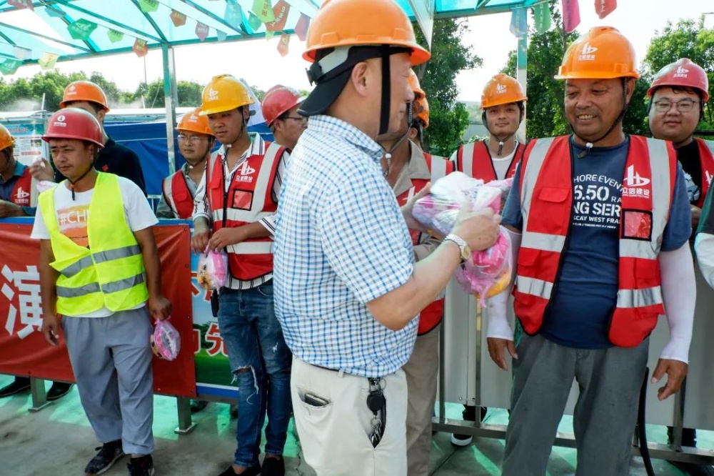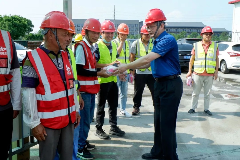 在施工現(xiàn)場,洪志躍、張玉升等將毛巾、香皂、礦泉水等防暑降溫用品一份份送到工友們手里,向一線施工人員了解工作和生活情況,叮囑大家在高溫期間要注意保重身體、勞逸結(jié)合,并對他們的艱辛付出表示感謝。同時,要求項目部要合理安排好施工時間,在確保安全的前提下,高質(zhì)量推進項目建設(shè),圓滿完成任務(wù)。