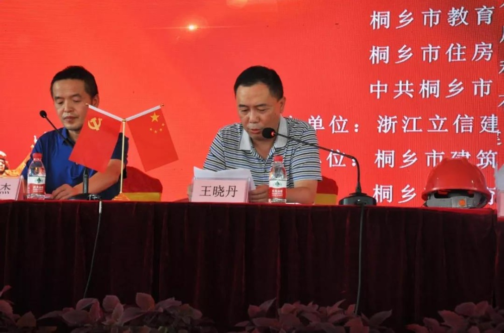 會議先后由教育局副局長王曉丹、桐鄉(xiāng)市城區(qū)開發(fā)管理委員會副主任吳康致辭,浙江立信建設集團有限公司副總經理顧云杰和浙江北圣建設有限公司總經理朱偉良作交流發(fā)言;中共桐鄉(xiāng)市石門鎮(zhèn)委員會黨委副書記楊雄金對創(chuàng)建“紅色工地”,進一步深化黨建引領工作作重要講話。