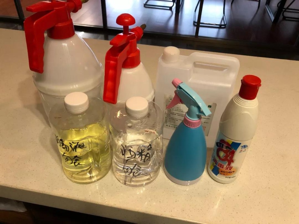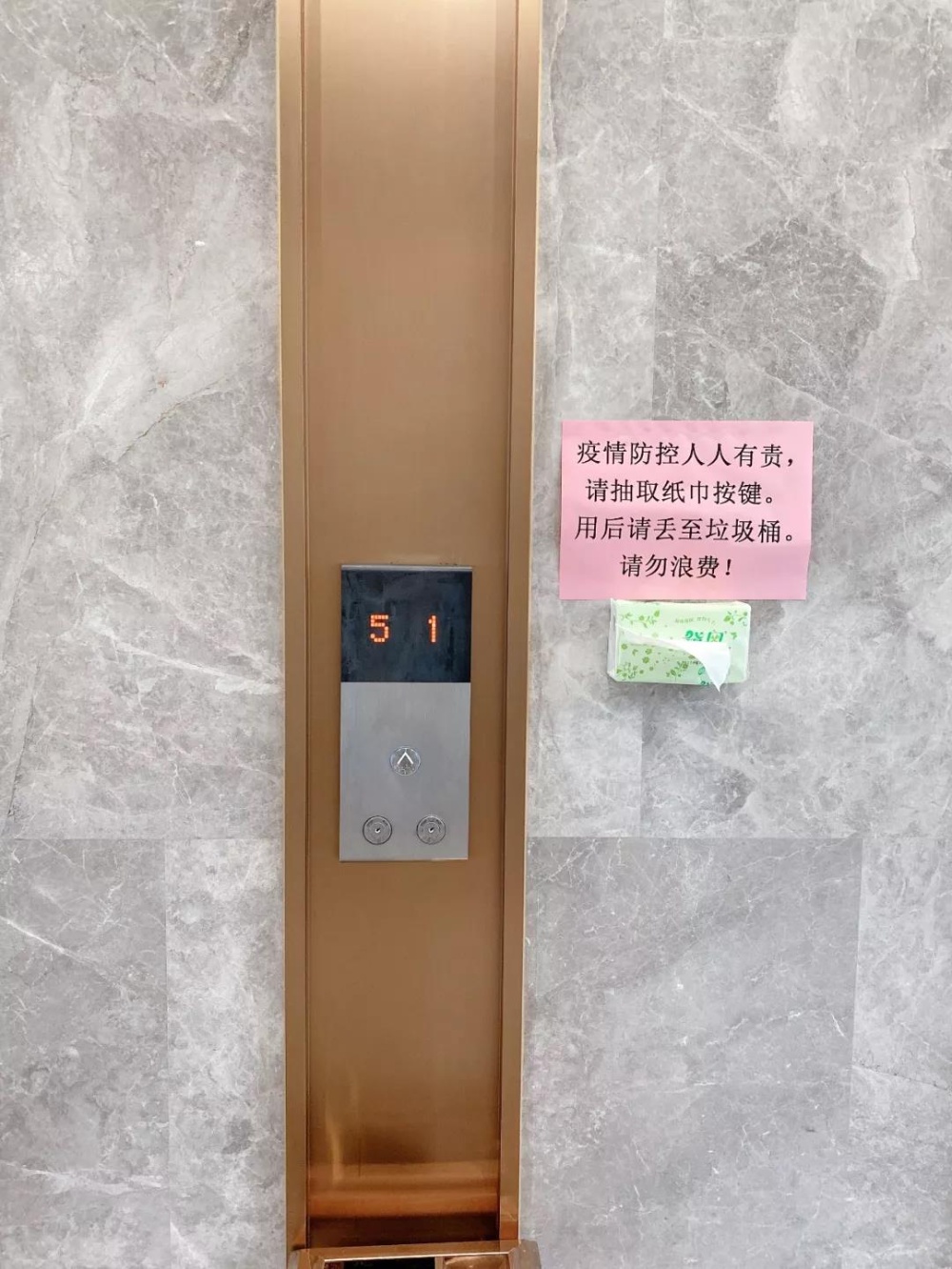 各樓層配備消毒物品及用具,每層電梯廳及電梯放置紙巾用于按電梯按鈕,設(shè)置廢棄防疫物品專用垃圾桶。